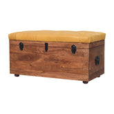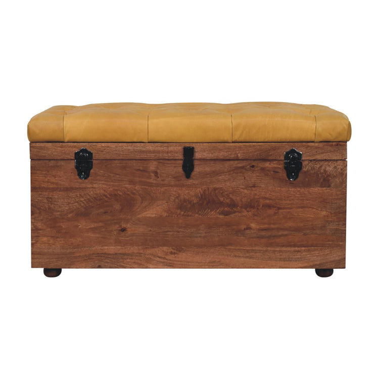 Crafted from 100% solid mango wood, this lid-up storage box exudes charm in a honey caramel finish. Adorned with a luxurious buffalo hide brown leather upholstery and deep button design, it's a comfortable yet stylish seating option. The concealed compartment offers discreet storage for household items, perfect for hallways or bedrooms, adding both elegance and functionality to your space.